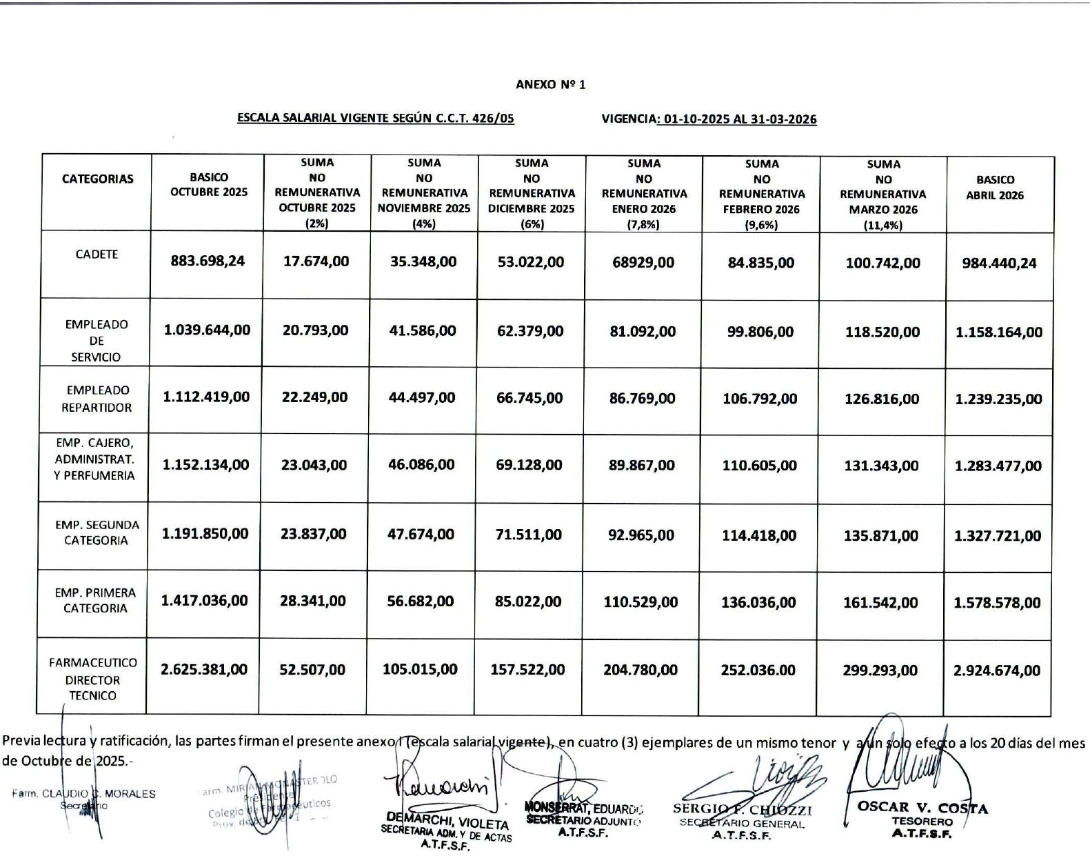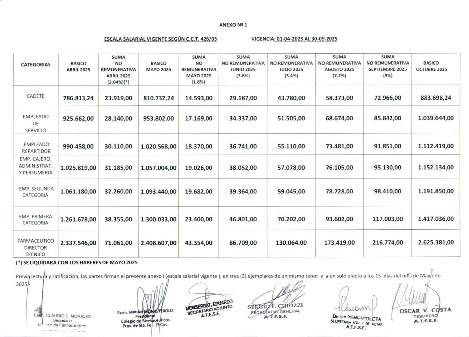 Cras. y cros. se brindan los documentos con la aplicación de la clausula de revision con el colegio de farmacéuticos y la asoc. farmacias mutuales y sindicales de la rep. Argentina el cual se refleja en la escala salarial anexo I Que le estamos adjuntando Cualquier duda al respecto consultarnos.